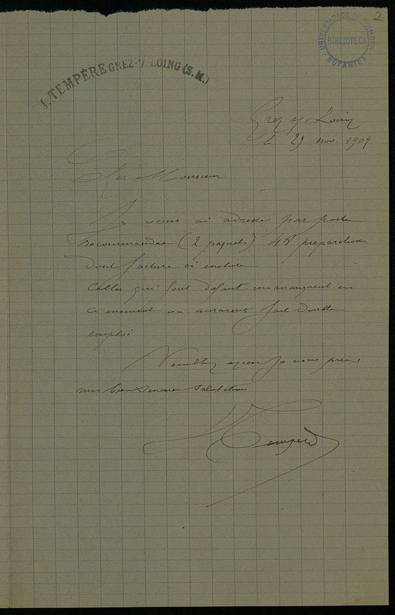 [Lettre], 1909 nov. 29, Grez sur Loing, [à Júlio Henriques, Coimbra]