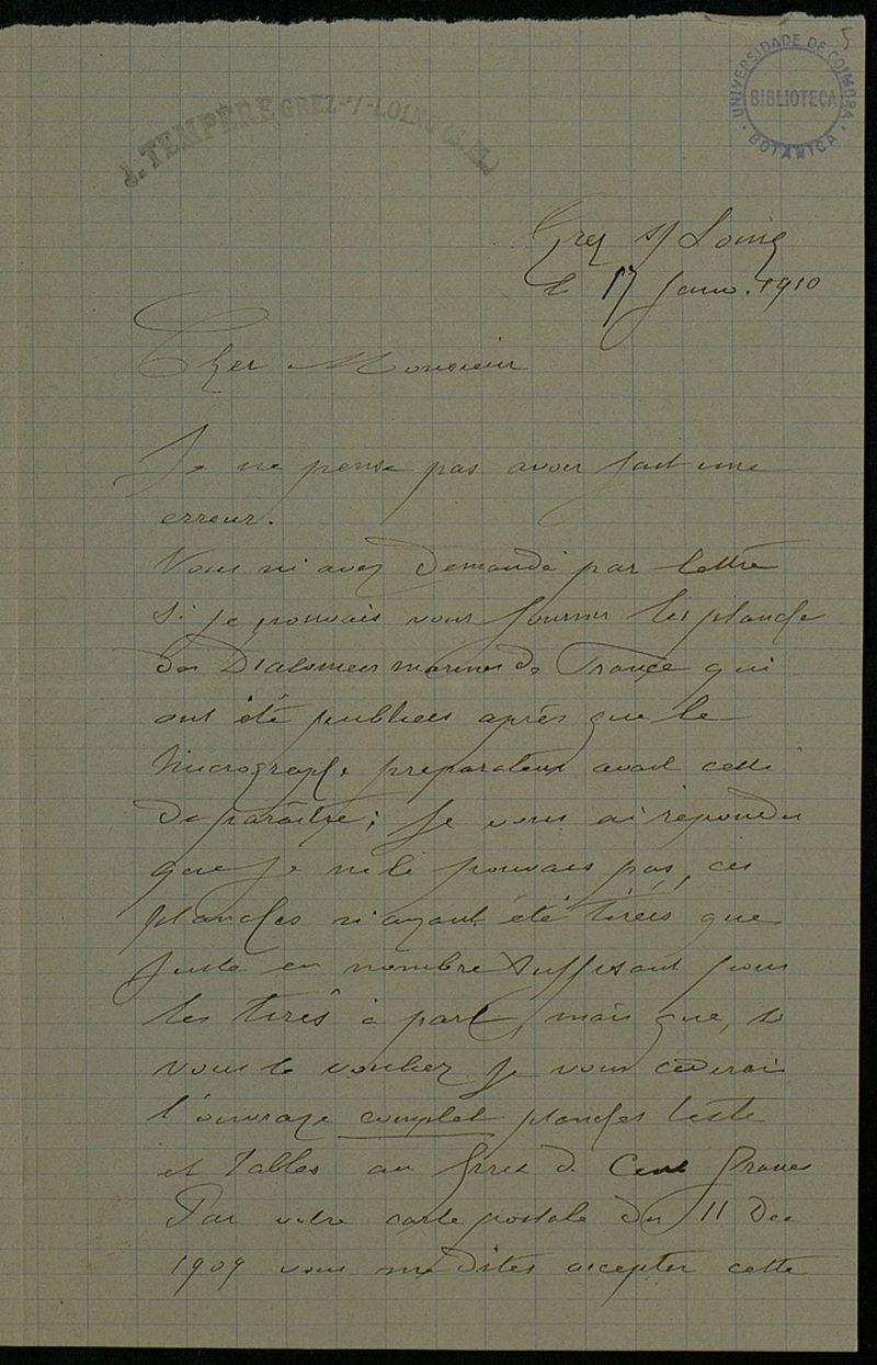 [Lettre], 1910 jan. 17 , Grez sur Loing, [à Júlio Henriques, Coimbra]