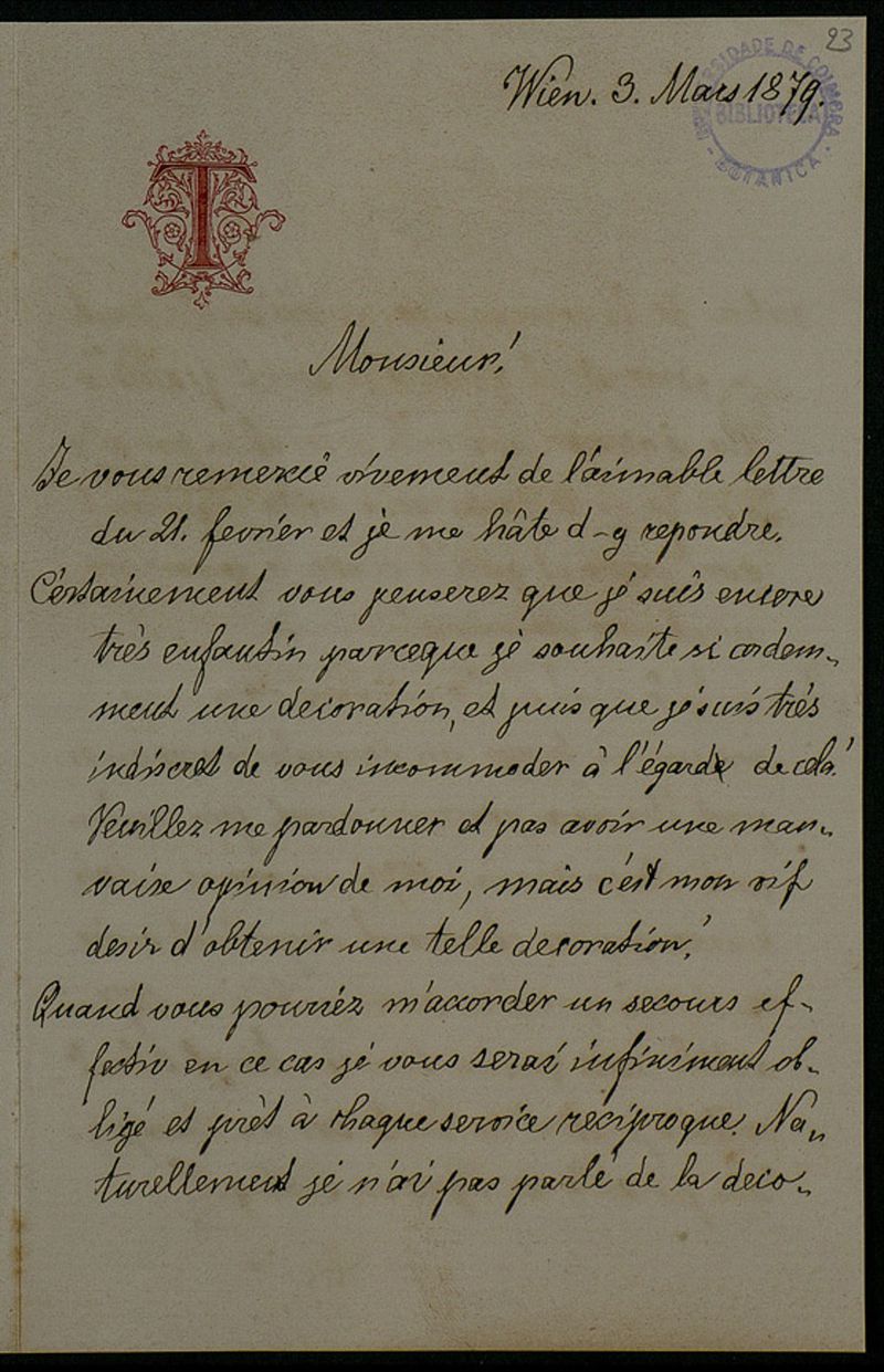 [Lettre], 1879 mars 3, Wien, [à] Monsieur [Júlio Henriques, Coimbra]
