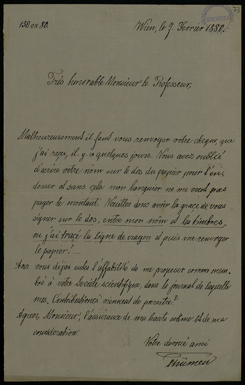 [Lettre], 1880 fév. 7, Wien, [à] Monsieur le Professeur [Júlio Henriques, Coimbra]