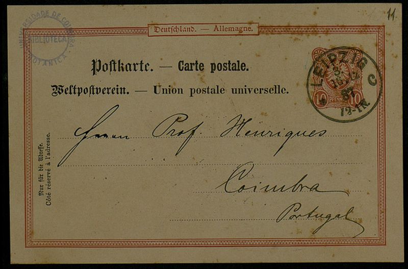 Postkarte, 1887 déc. 16, Leipzig, à Prof. [Júlio] Henriques, Coimbra