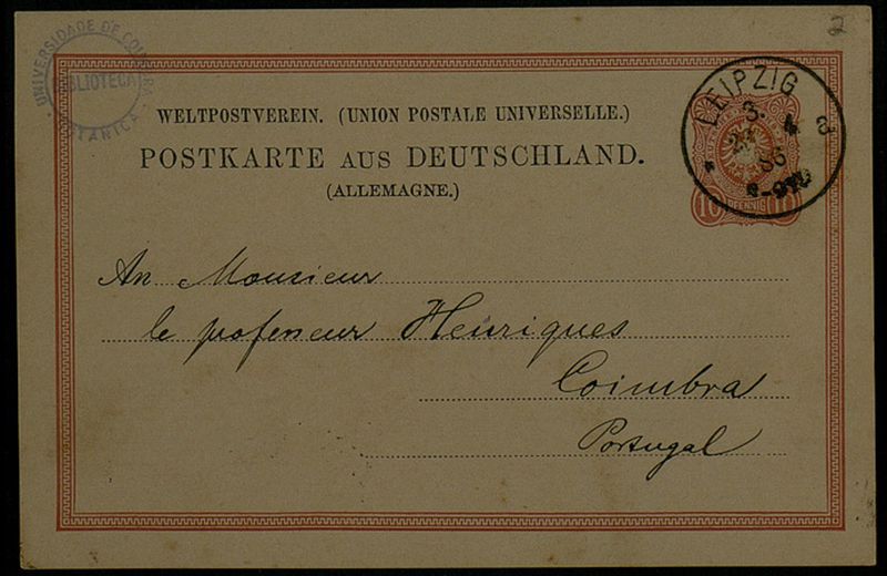 Postkarte aus Deutschland, 1886 avr. 22, Leipzig, an Monsieur le professeur [Júlio] Henriques, Coimbra