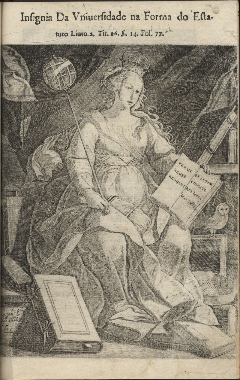 Gravura alegórica representando uma figura feminina em corpo inteiro sentada, personificando a Sabedoria, com coroa real na cabeça sustentando sobre o joelho direito um livro aberto onde se lê a Insignia da Universidade 2Per me reges regnant et legum conditores justa deceru[n]t3. Na mão direita sustenta um bastão encimado por pequena esfera armilar. Como motivos alegóricos vários livros sobre um dos quais se vê um mocho. No alto da página em caracteres tipográficos está impressa a legenda 2Insignia da Universidade na formação do Estatuto3, subscrita 2Iosepha d'Ayalla. Obidos 16533.