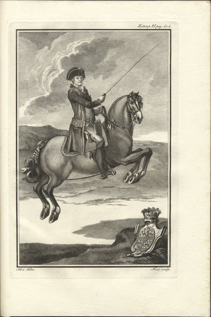 Andrade, Manuel Carlos de Luz da liberal, e nobre arte da cavallaria, offerecida ao senhor D. João Principe do Brazil. Lisboa : Regia Officina Typografica, 1790, p. 404, est. 81.
