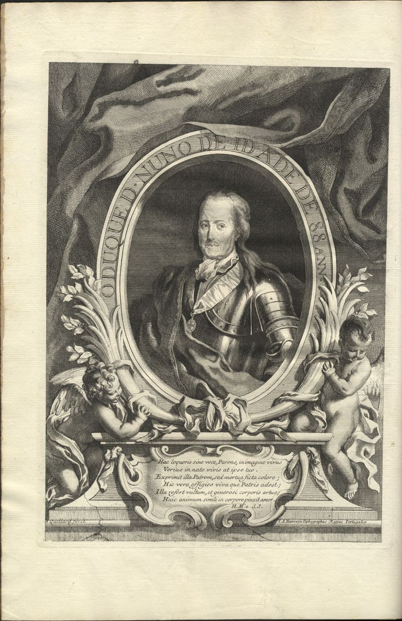 Retrato do Duque de Cadaval, a meio corpo, olhando para a frente, cabeça descoberta. Ao peito ostenta o hábito de Cristo, veste armadura, tudo em uma oval assente sobre peanha sustentada por duas figuras aladas e aberta em um fundo sem limitação, formado por largo e pragueado reposteiro com tarja que decora a cortina e emoldurado, em redor a legenda "O Duque D. Nuno de Idade de 88 Ann.". Na parte inferior da peanha, cartela com versos latinos.