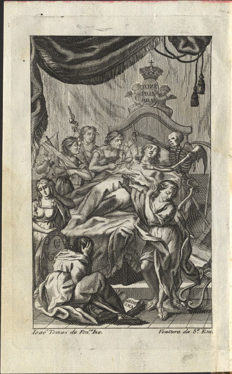 A estampa alegórica à morte do Príncipe D. José que ilustra Noites Josephinas apresenta o retratado prostrado no seu leito sobre cujo espaldar se vê o escudo com o seu nome, rodeado pelas três parcas armadas dos seus atributos simbólicos, Cloto que fia o destino dos homens, Láquesis que faz girar o fuso e estica o fio [da vida] até ao final e Átropos aquela que corta o fio da vida e, da Morte prestes a feri-lo, vêem-se ainda a Poesia, a Medicina e a Pátria personificadas em figuras femininas chorando a sua perda, assinada por 2Ioaõ Tomas da Fon.ca inv.3 e 2Ventura da S.ª exc.3