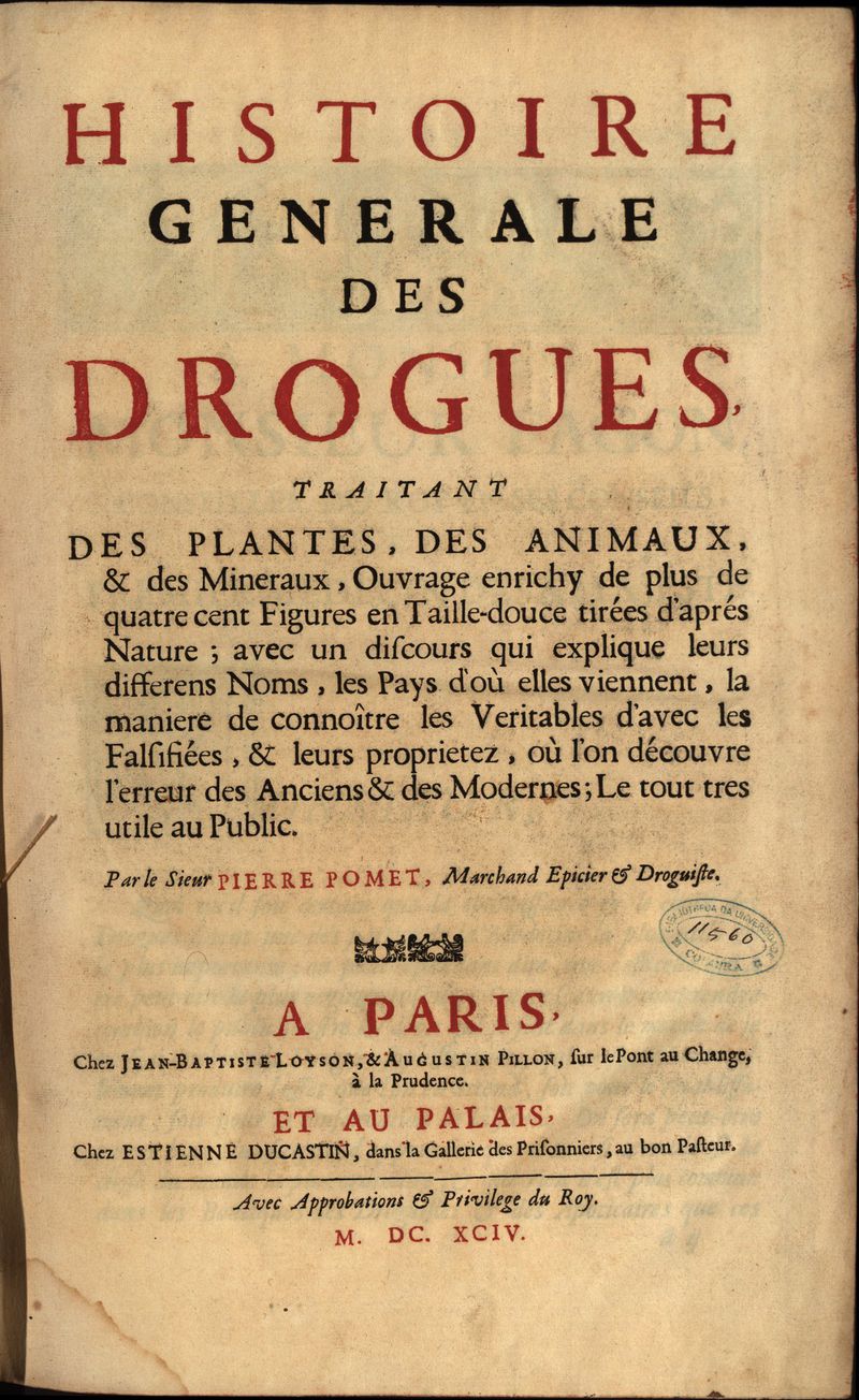 Histoire generale des drogues, traitant des plantes, des animaux, & des mineraux, ouvrage enrichy de plus de quatre cent figures en taille-douce tirées d'aprés nature, avec un discours qui explique leurs differens noms, les pays d'où elles viennent, la