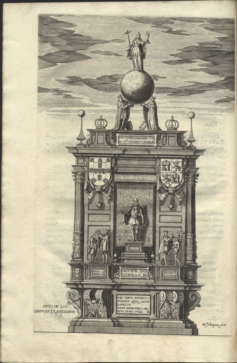 Obra ilustrada por estampas abertas pelo mesmo gravador, representando os artísticos arcos triunfais, levantados nas ruas de Lisboa, quando da visita régia de Filipe I de Portugal. Este arco representa a oferta dos ourives e lapidários ao Rei. Sobre uma peanha, em cima de um dossel brocado, a estátua de D. Filipe I em pé retratado com o trajo com que entrou em Lisboa em 1581. Na mão esquerda um cetro, na direita a união das coroas de Espanha e Portugal, no plano inferior da peanha estão representados os navegadores, à direita Vasco da Gama e à esquerda Cristóvão Colombo encimadas cada uma das colunas pelas armas de Portugal e Castela. No topo as figuras de Hercules e Atlante sustentam um globo terrestre, sobre o globo a imagem da Fé e ainda a legenda 2Accipe do geminas, pariter servare memento corruet imperium, si ruat una, tuum. Gama aperit, fidei pro luce, dat India gemmas. Invenit Colon dat America lancibus aurum sto super alma fides, subiectum sustinet orbem Lusitana pari gens, et ibera manu. Ac meus Alcides et Atlas, nec pondera sentit machina, dat vires, vel pede tacta meo3. Na base da peanha, em latim, dedicatória a Felipe I pelos ourives e lapidários.