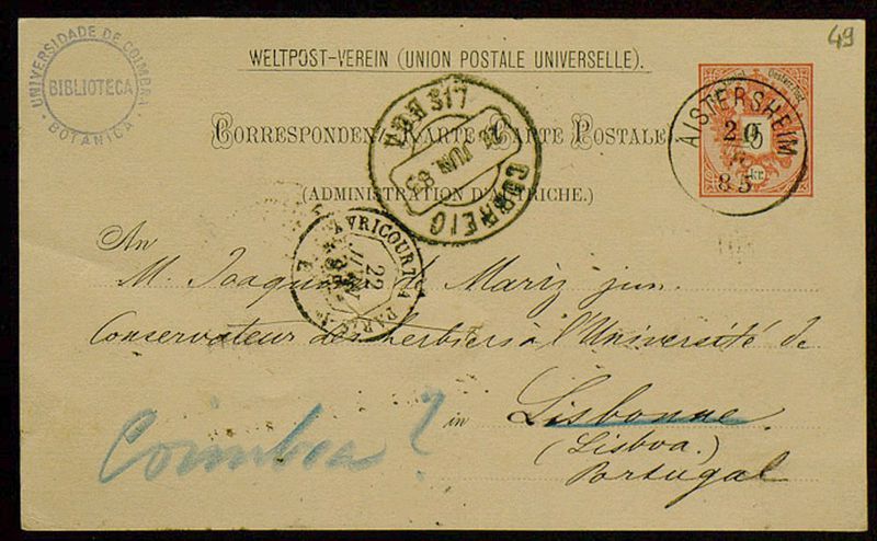 Correspondenz-Karte, 1885 juin 20, Aistersheim, [à] Joaquim de Mariz, Lisbonne
