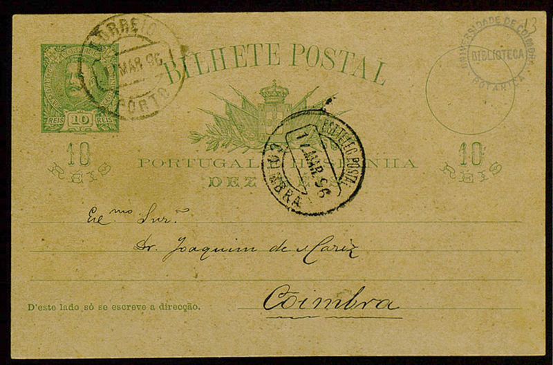Bilhete Postal, 1896 Mar. 17, Porto [a] Dr. Joaquim de Mariz, Coimbra