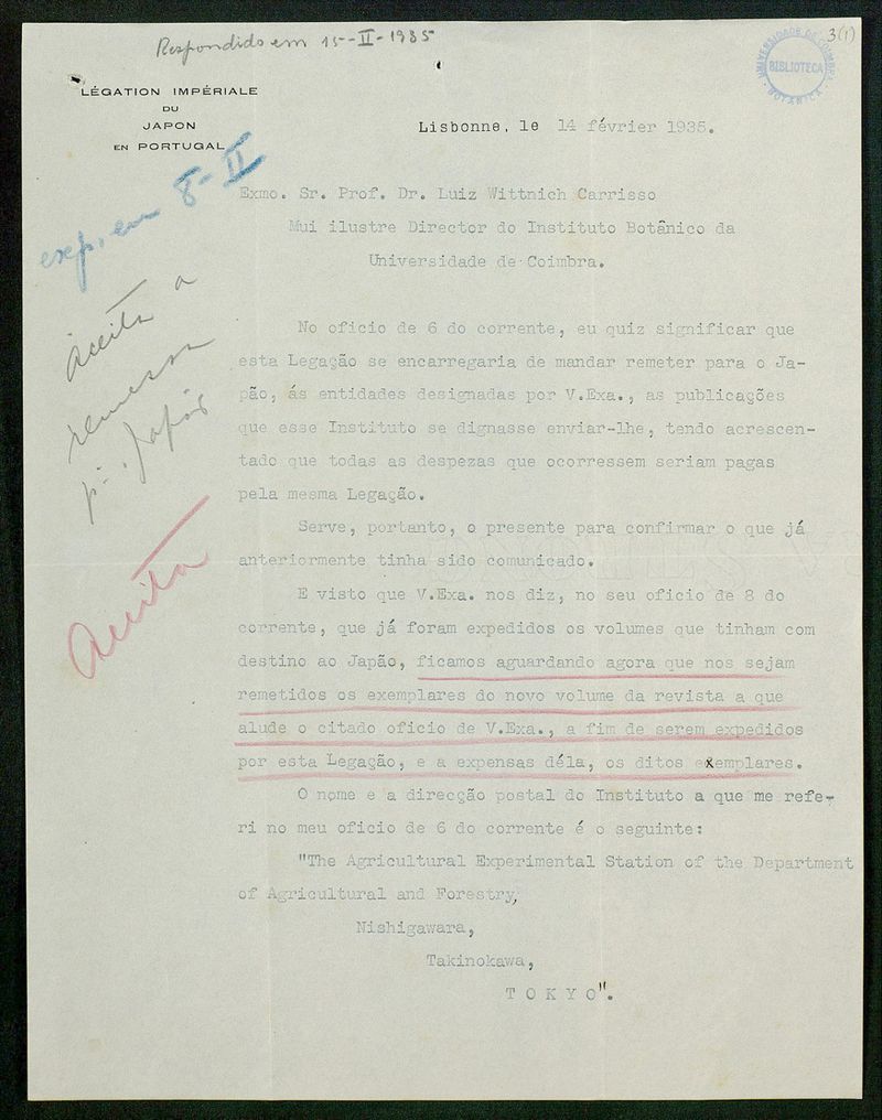 Papel timbrado de: Légation Impériale du Japon en Portugal.