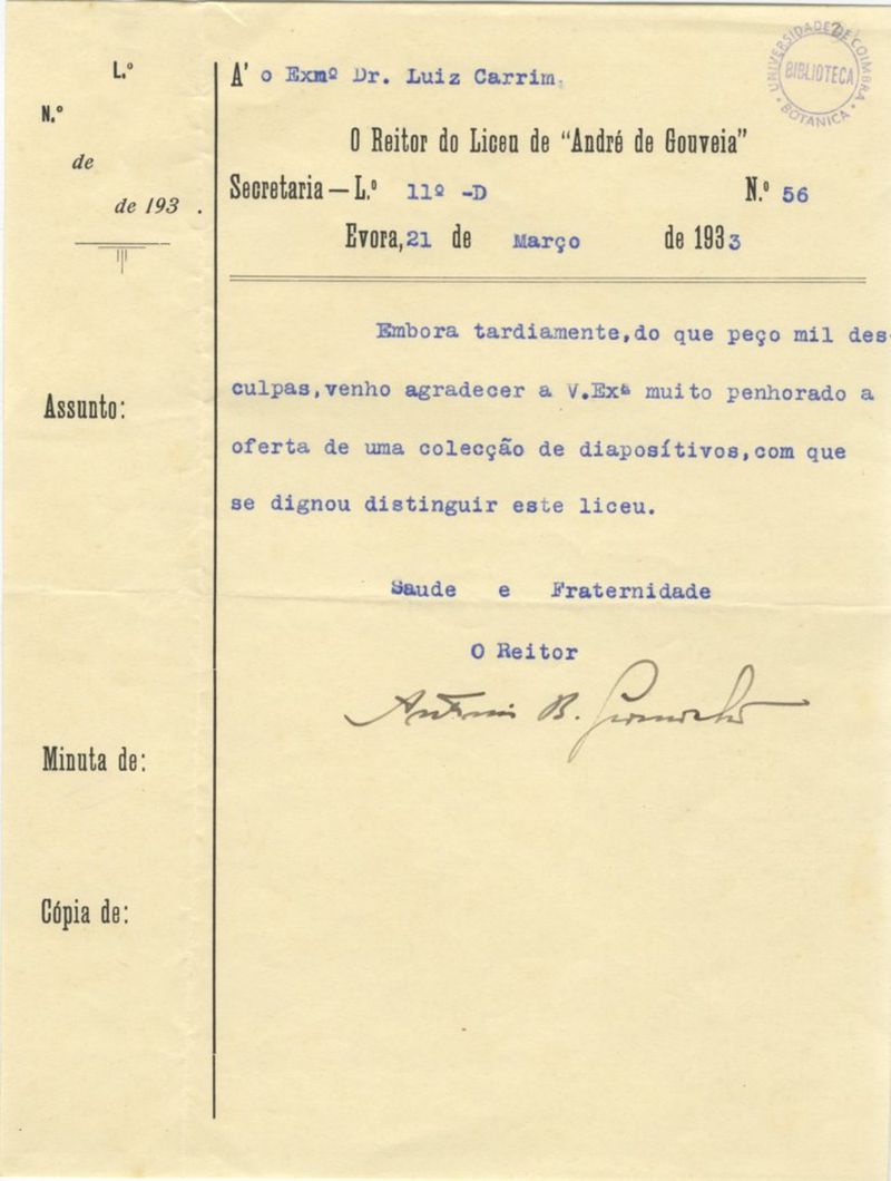 Em papel timbrado de "O Reitor do Liceu de "André de Gouveia"".