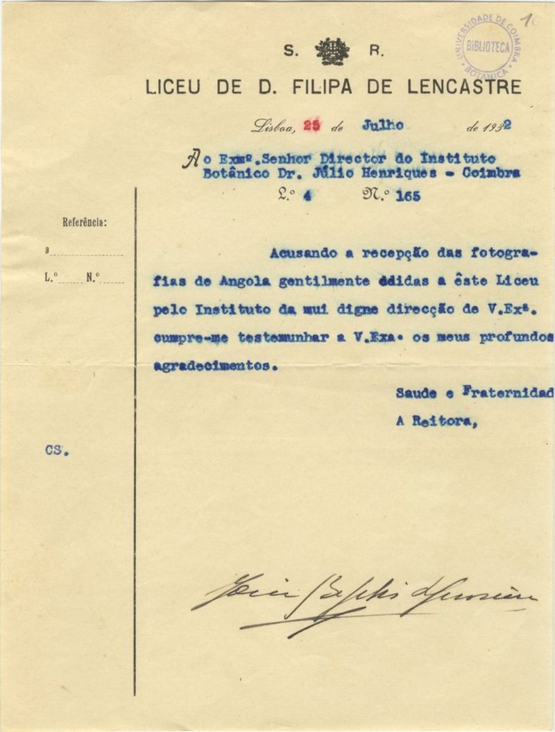 Em papel timbrado de "Liceu de D. Filipa de Lencastre".