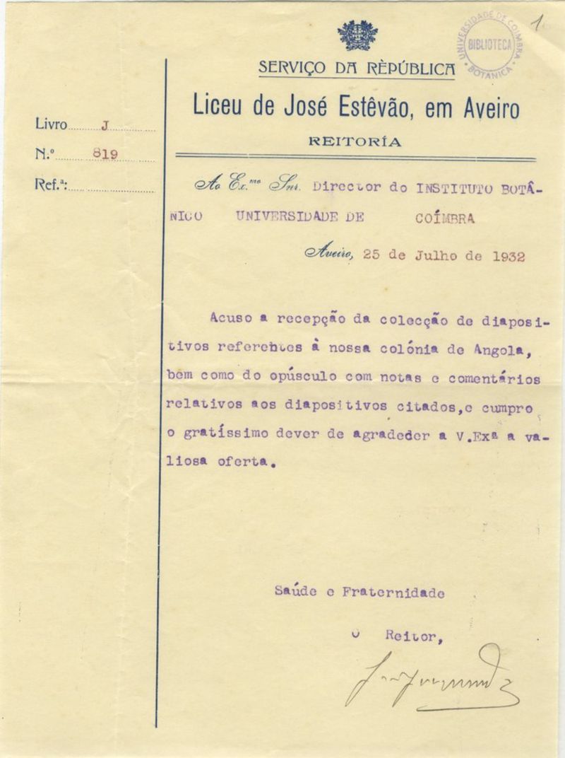 Em papel timbrado de "Liceu de José Estevão em Aveiro - Reitoria".
