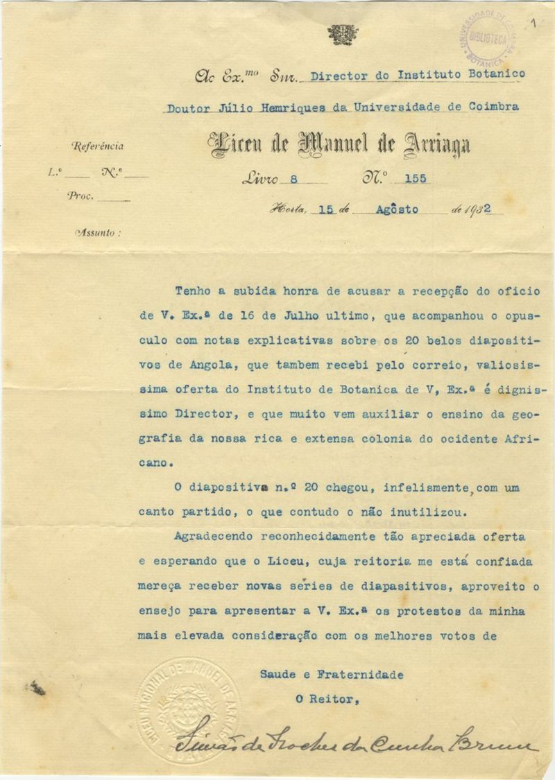 Em papel timbrado de "Liceu de Manuel de Arriaga"; com selo branco.