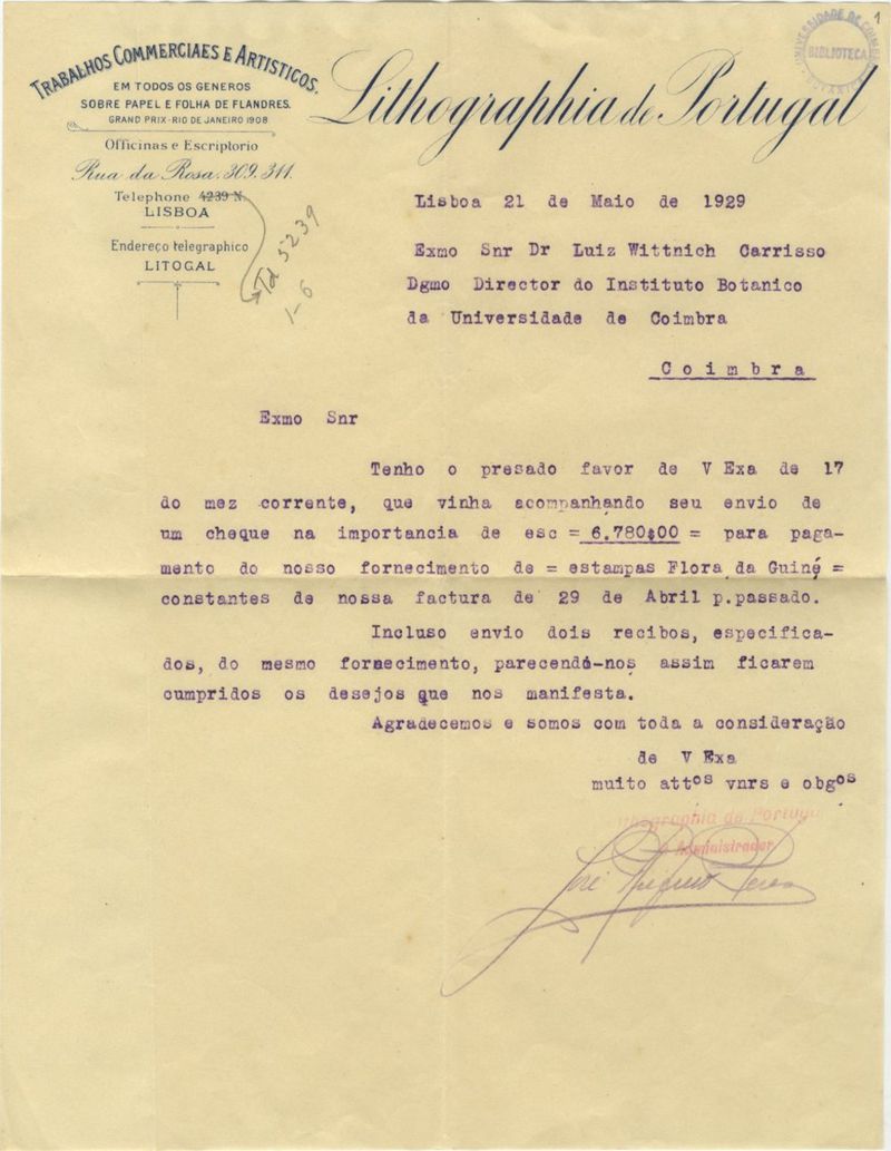 [Carta], 1929 Maio 21, Lisboa, [a] Luiz Wittnich Carrisso, Coimbra