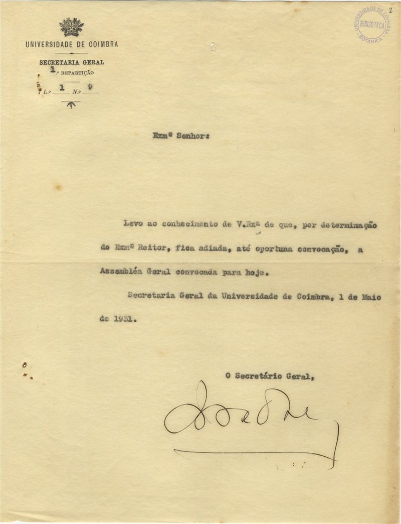 Em papel timbrado de " Universidade de Coimbra - Secretaria Geral".