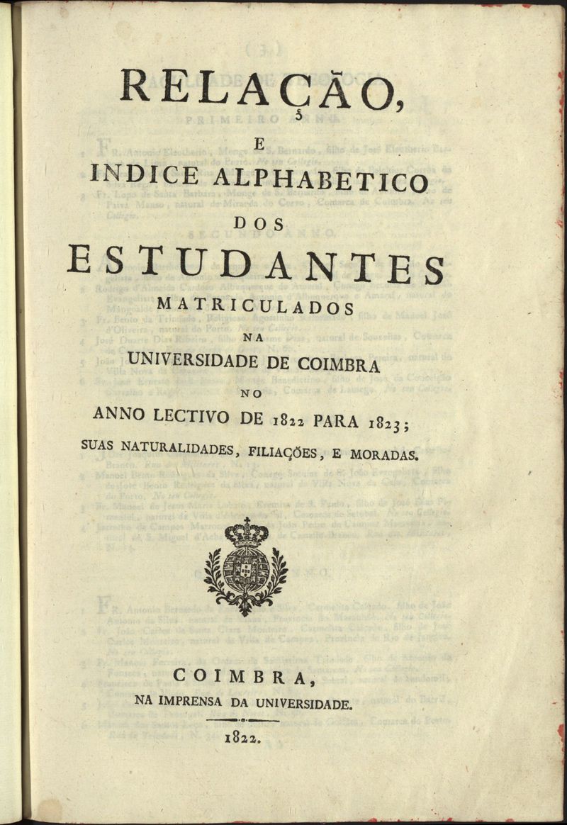 Relação e índice alfabético dos estudantes matriculados na Universidade de Coimbra e no Liceu