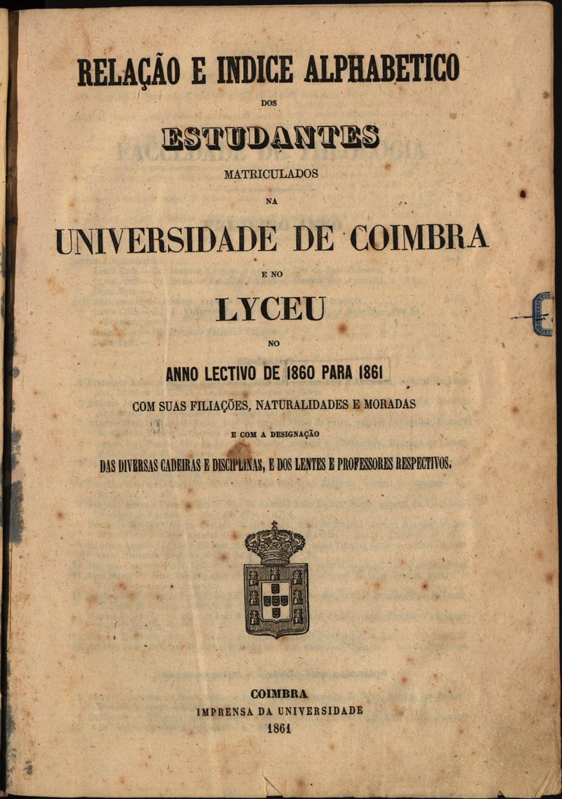 Relação e índice alfabético dos estudantes matriculados na Universidade de Coimbra e no Liceu