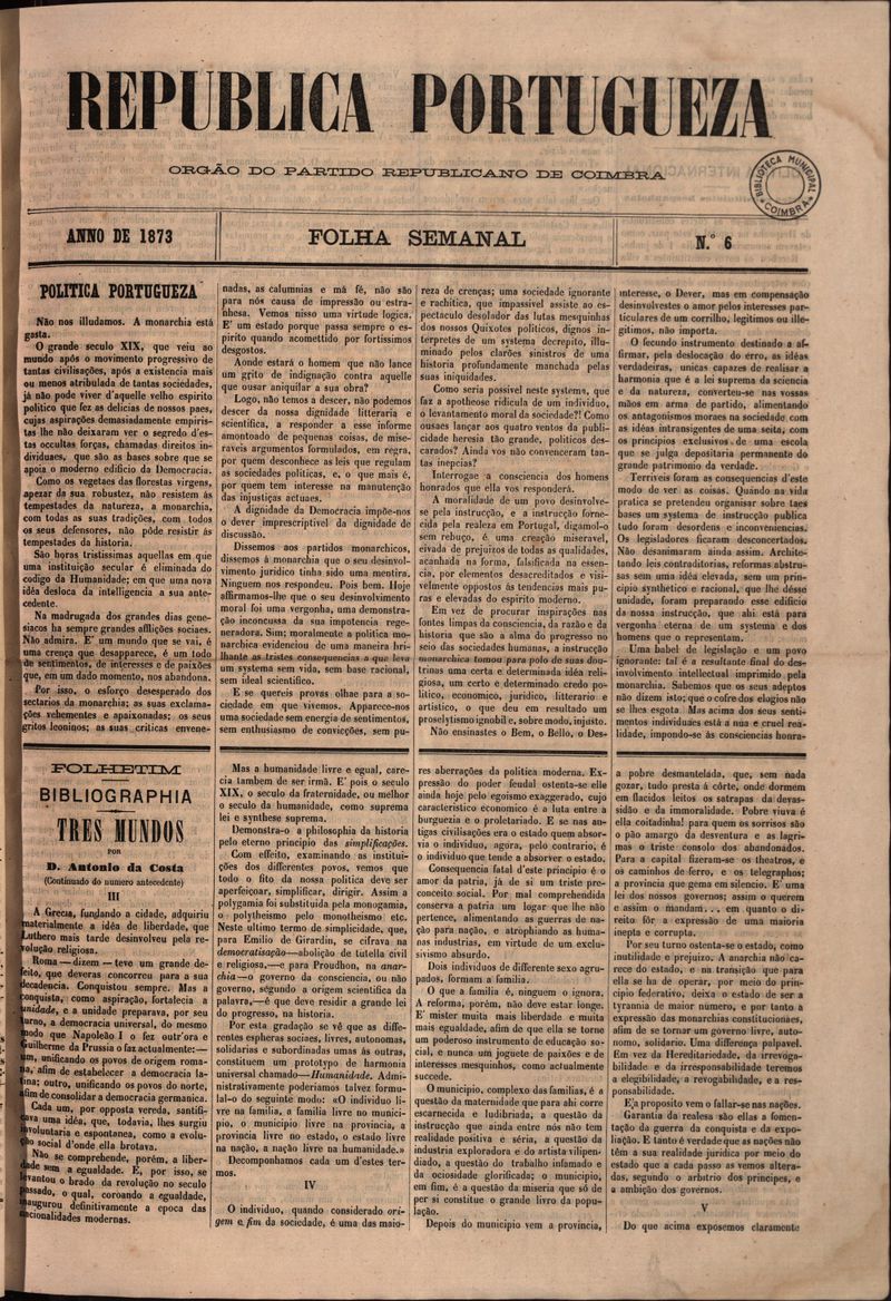 Republica Portugueza : folha semanal - 1873, Junho 04, quarta-feira - Nº6