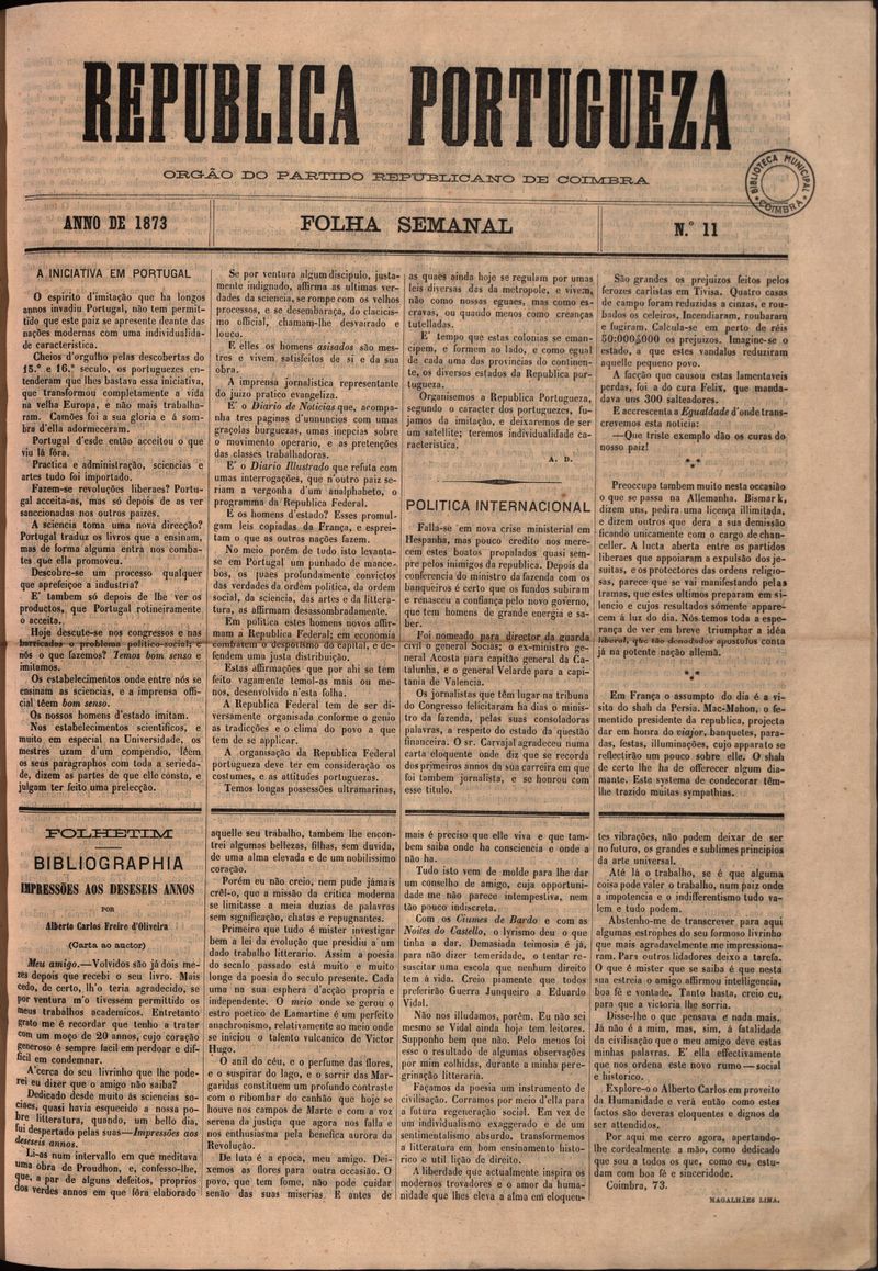 Republica Portugueza : folha semanal - 1873, Julho 02, quarta-feira - Nº11