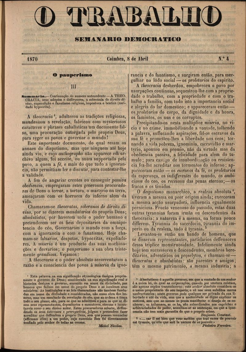 O trabalho : semanário democrático - 1870 Coimbra, 8 de Abril N.° 4