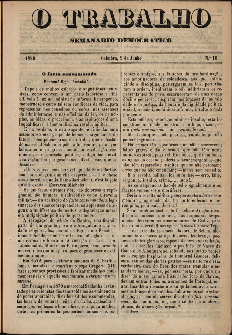 O trabalho : semanário democrático - 1870 Coimbra, 9 de Junho Nº 10