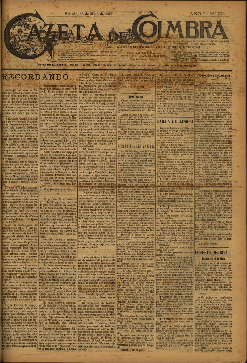 Gazeta de Coimbra 1912, Maio 18, sábado - Nº92