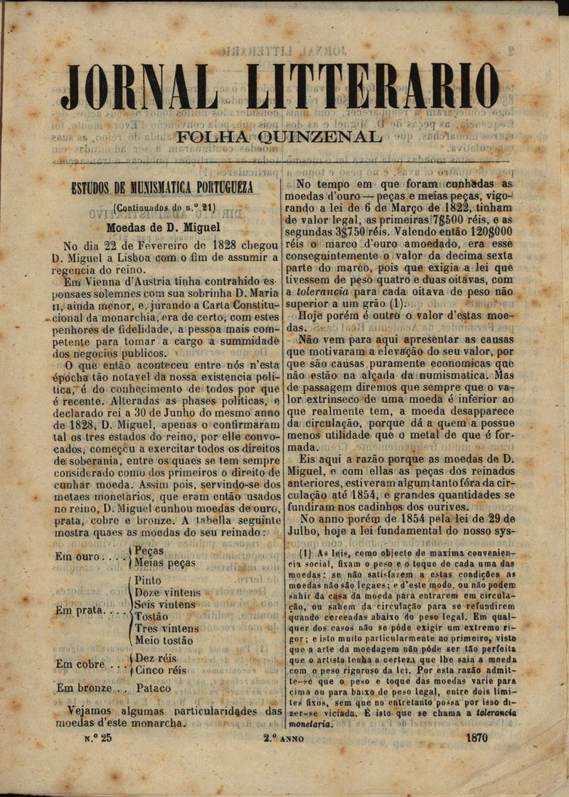 Jornal litterario : periódico quinzenal destinado a artigos de litteratura e sciencias – Nº25