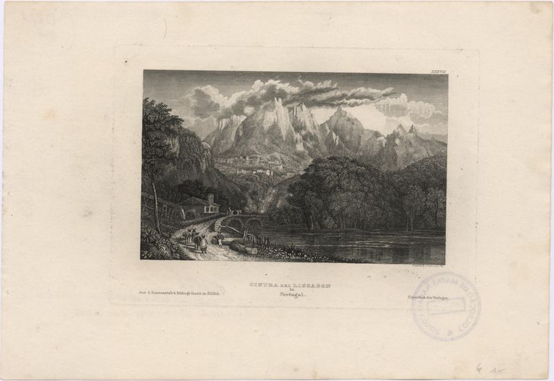 Estrada de acesso a Sintra com 4 pessoas e 3 burros, ao longe vê-se a vila de Sintra e montanhas.