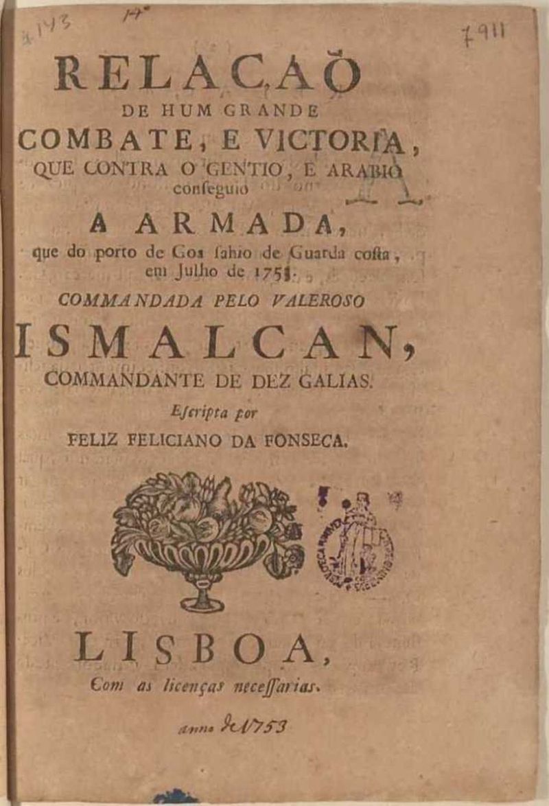 Relação de um grande combate, e vitória, que contra o gentio, e arábio conseguiu a Armada, que do porto de Gôa saiu de Guarda costa, em Julho de 1753 ..