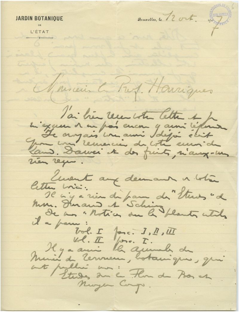 [Lettre], 1907 oct. 12, Bruxelles, à Monsieur le Prof. [Júlio] Henriques, [Coimbra]