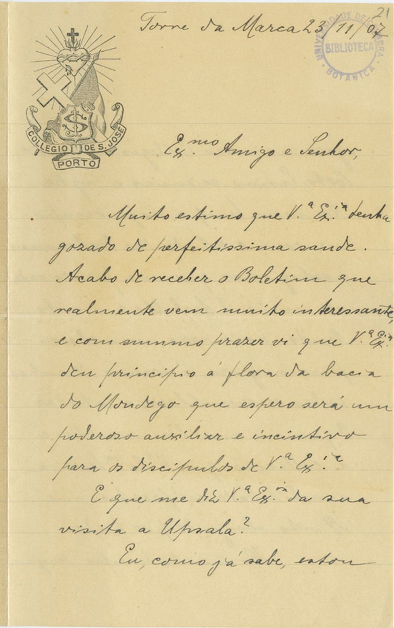 [Carta], 1907 Nov. 23, Torre da Marca, [a Júlio Henriques, Coimbra]