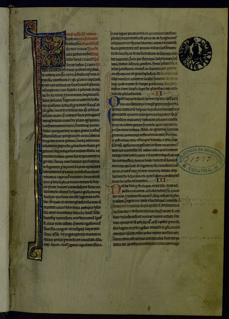 39 inic. cap. ornamentadas a ouro e cores, com motivos de flora; 9 inic. cap. ornamentadas com motivos de folha de acanto; 27 inic. cap; Inic. cap. a azul e vermelho. filigr. a our