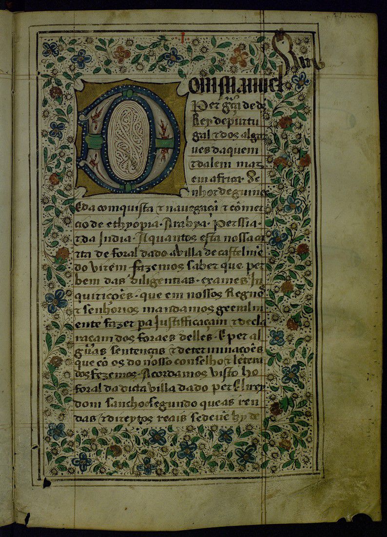 Inic. cap. ilum. a ouro e cores e cercadura ilum. a cores com motivos florais no f. 3.