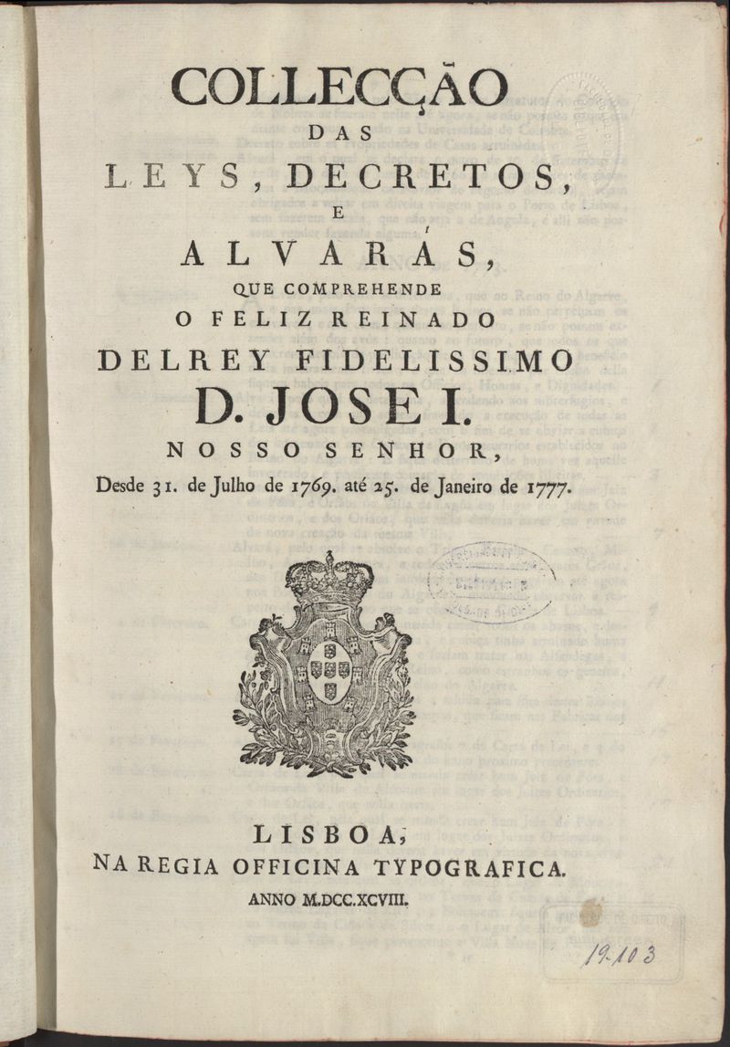 Colecção das leis, decretos, e alvarás, que compreende o feliz reinado del Rei fidelíssimo D. José o I