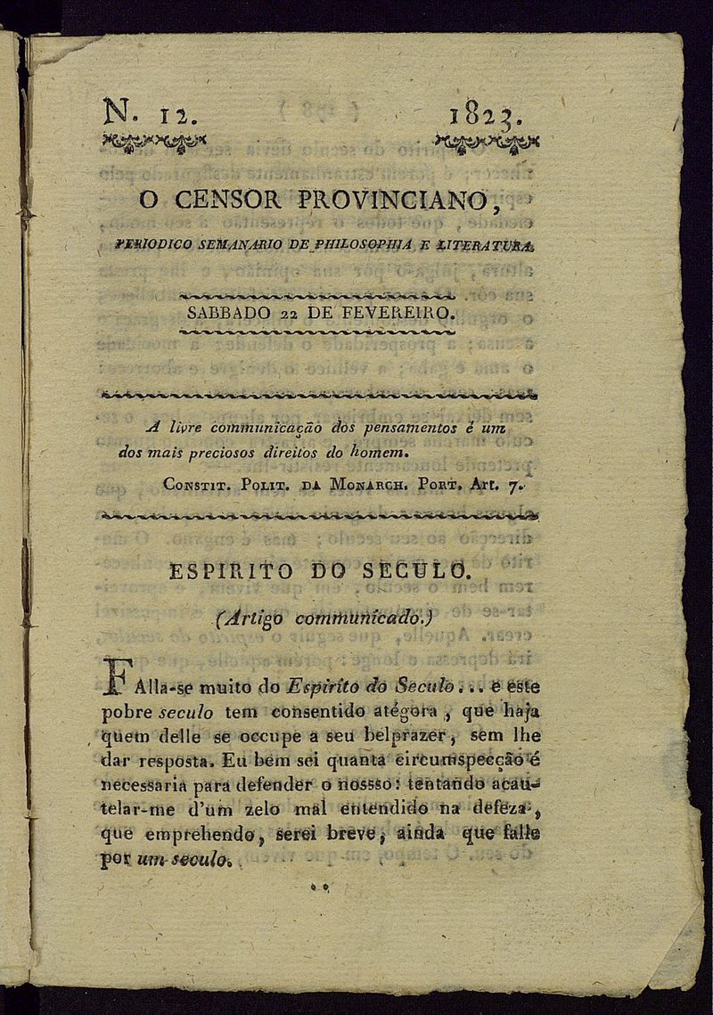Censor provinciano : periodico semanario de philosophia, politica e literatura - Nº 12