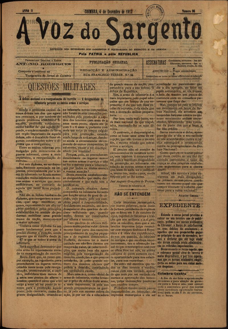 A voz do sargento : defensor dos interesses dos sargentos e equiparados do exército e armada - Nº96