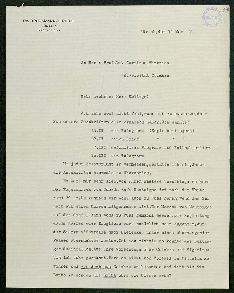 [Brief], 1921 März 11, Zürich, an Herrn Prof. Dr. Carisso Wittnich, Coimbra