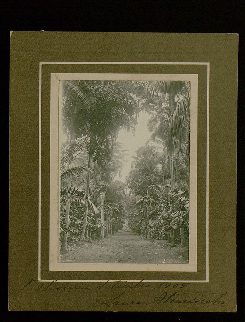 Nota ms. sobre a orla da fot.: "S. Thomé - Setembro 1905 - Laura Almeidinha". - Nota ms. no verso: "Avenida de palmeiras na Roça Rio do Ouro".