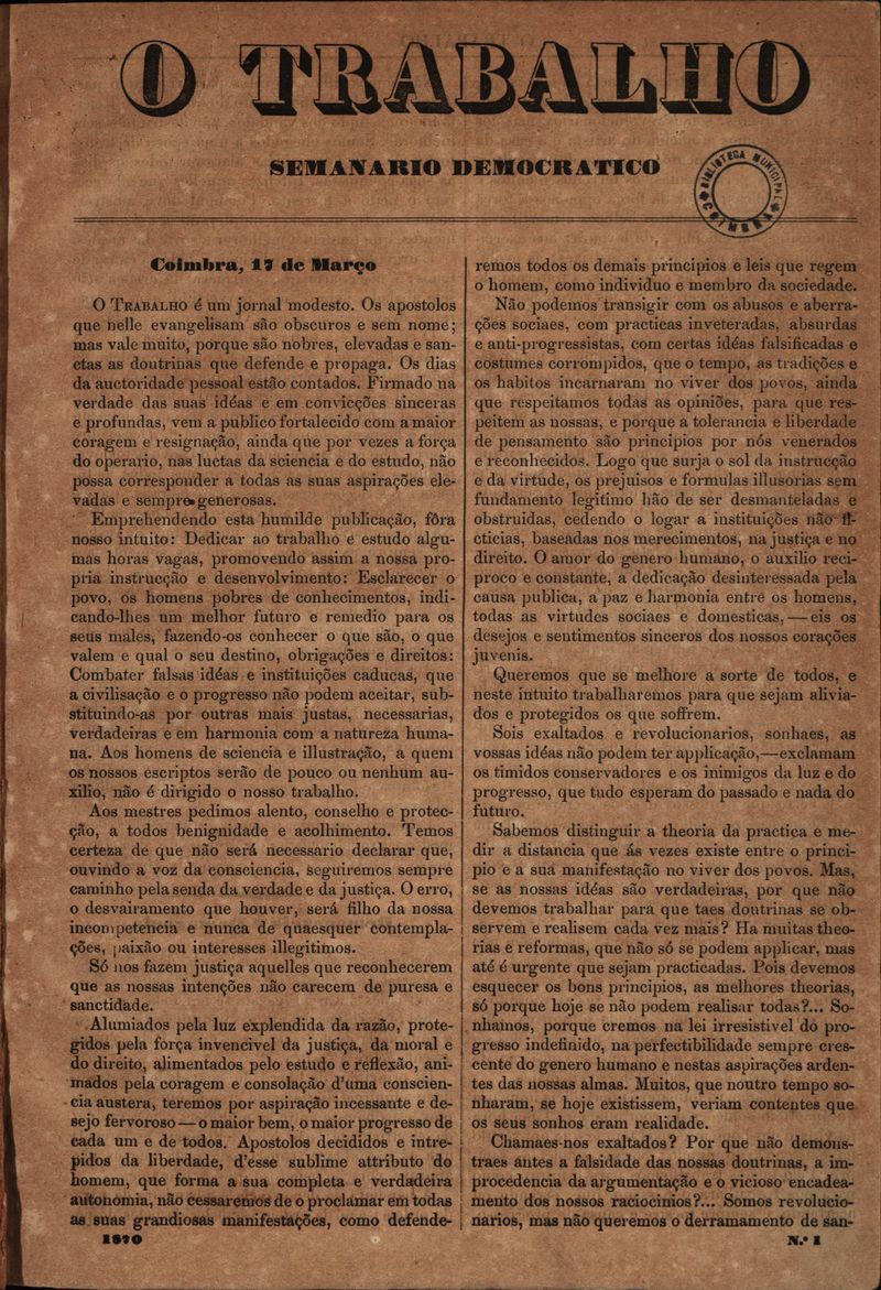 O trabalho : semanário democrático - [1870] Coimbra, 19 de Março [Nº1]