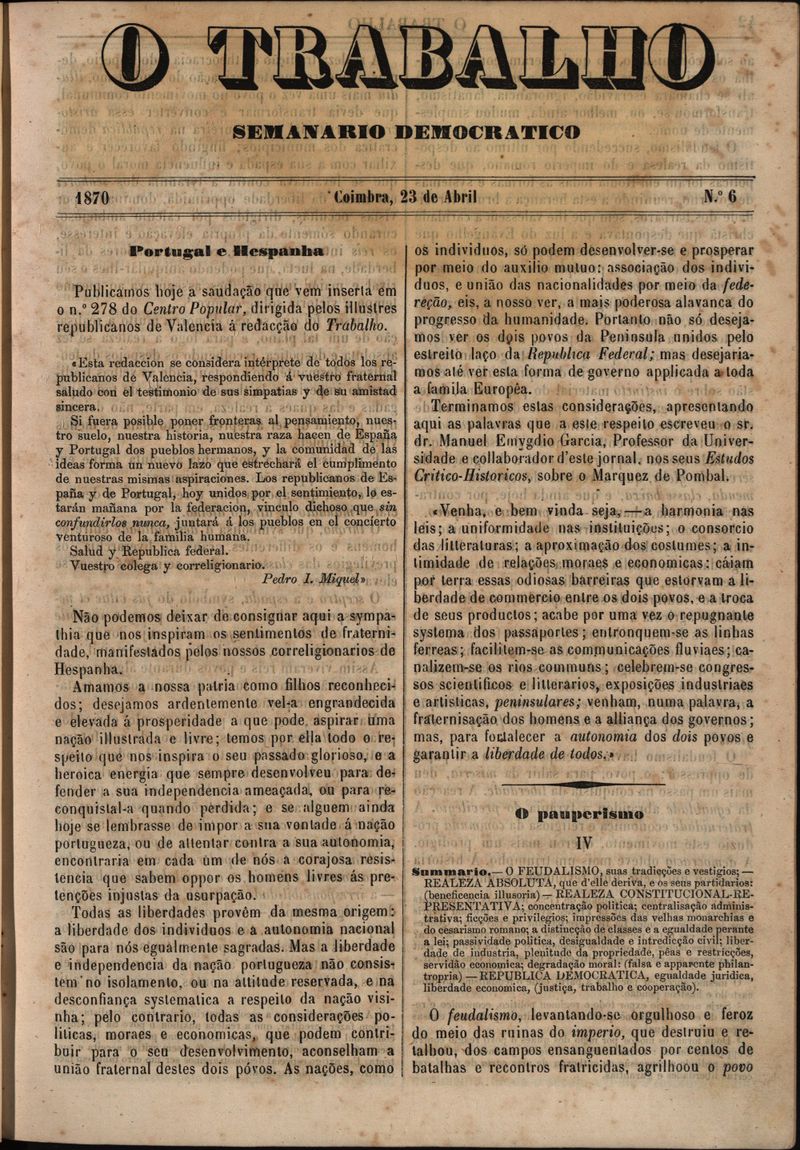 O trabalho : semanário democrático - 1870 Coimbra, 23 de Abril Nº 6