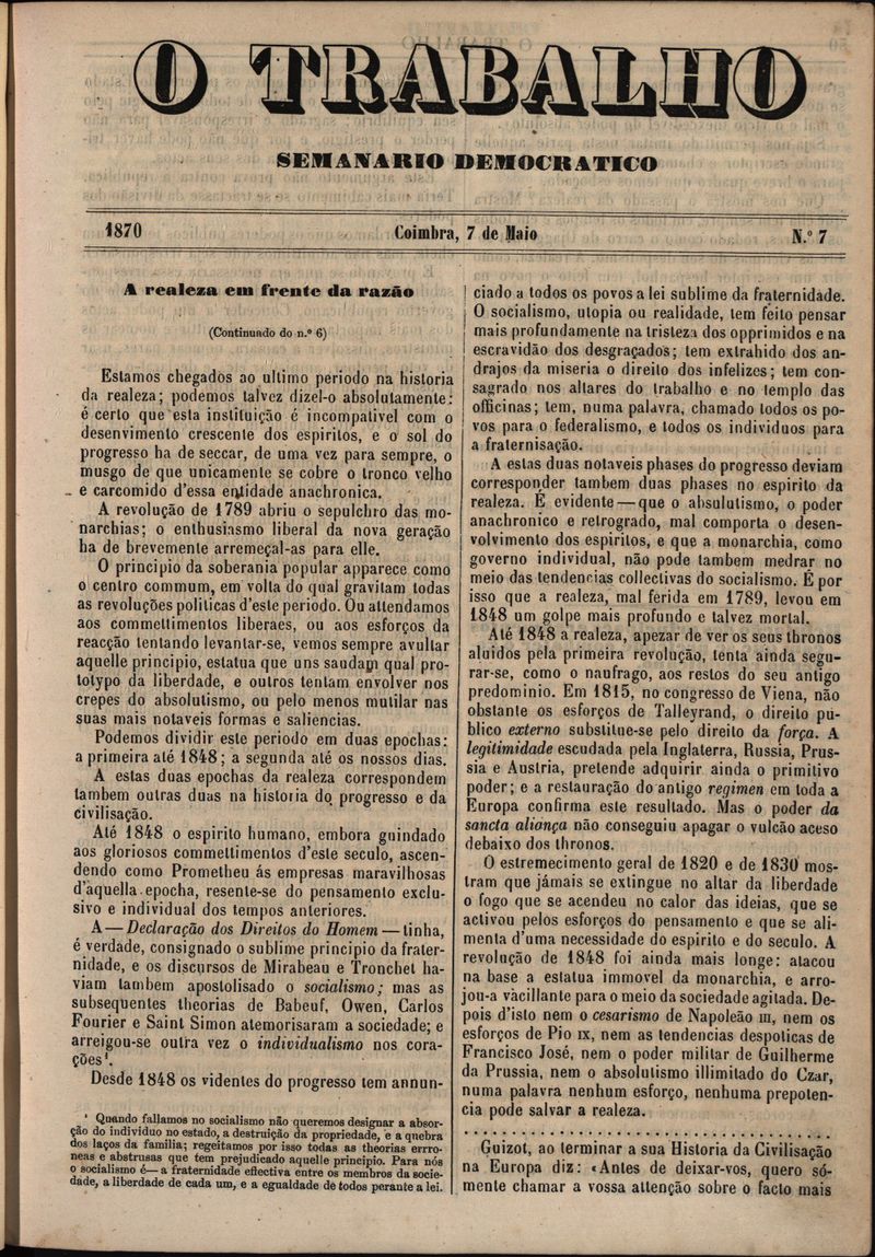 O trabalho : semanário democrático - 1870 Coimbra, 7 de Maio Nº 7